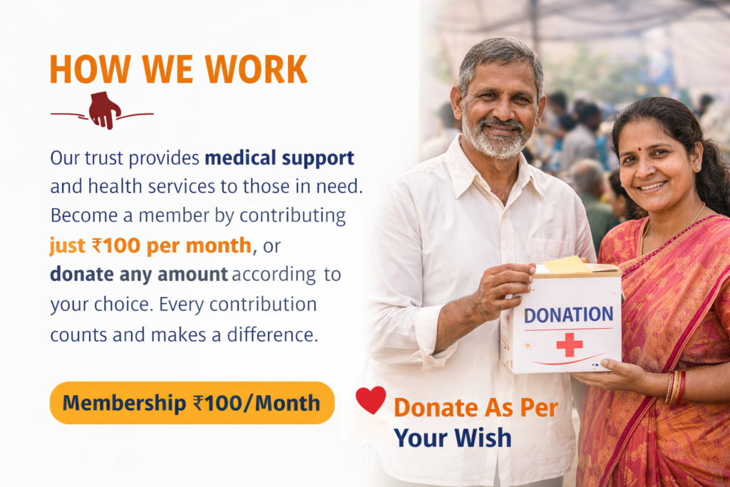Our trust works with a simple and transparent approach to help those in need. We run medical support programs, organize free health camps, and provide financial assistance for treatments through the support of our members and donors. Anyone who wants to be a part of our mission can join our Membership by contributing just ₹100 per month, which helps us create a steady source of support for ongoing healthcare initiatives. Apart from this, we also welcome donations of any amount, as per your willingness and capacity. Every contribution, big or small, plays an important role in saving lives and bringing hope to people who cannot afford proper medical care. Together, we can make a meaningful difference in society.